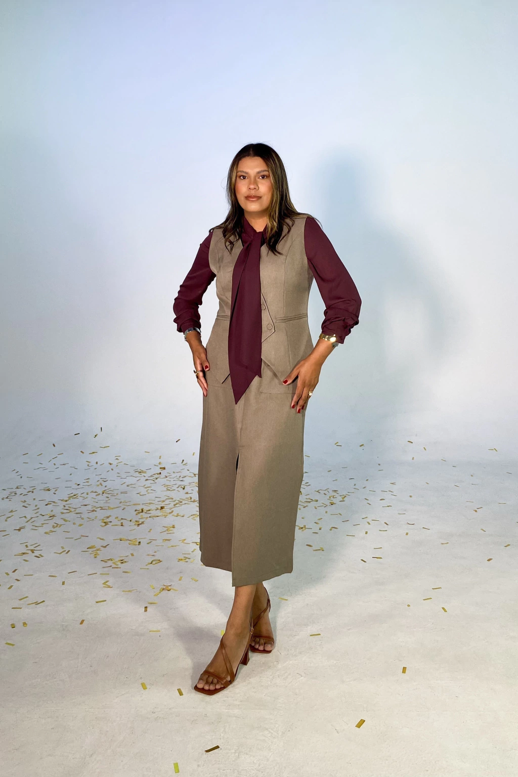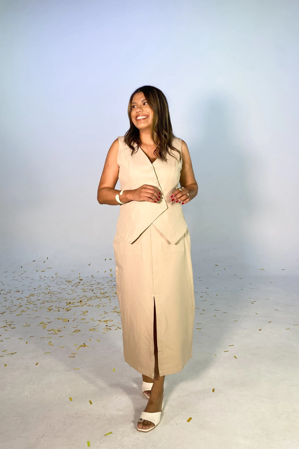 O colete curto apresenta botões forrados assimétricos, que adicionam um charme único ao visual, além de ser forrado para garantir conforto e acabamento impecável. Já a saia lápis midi conta com fecho invisível na parte de trás, uma fenda discreta na frente que oferece mobilidade e bolsos funcionais para maior praticidade no dia a dia.