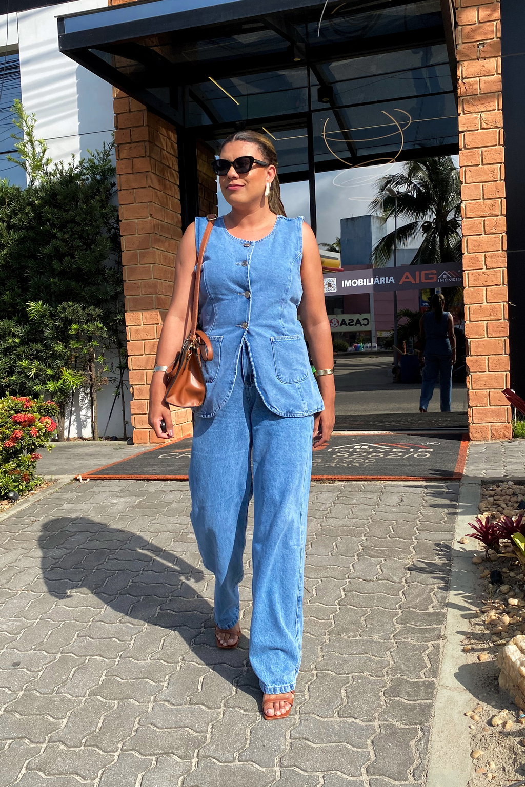 Descubra o charme do Conjunto Vienna Jeans, perfeito para quem busca uma combinação fashion e prática. Composto por uma calça wide leg de cintura alta e colete alongado, ele une tendências atuais com detalhes que valorizam o corpo e o visual.